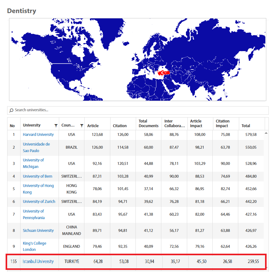 İÜ Diş Hekimliği Fakültesi Tüm Dünya Üniversitelerinin Branşlara Göre Akademik Performanslarını Değerlendirdiği URAP Sıralaması;